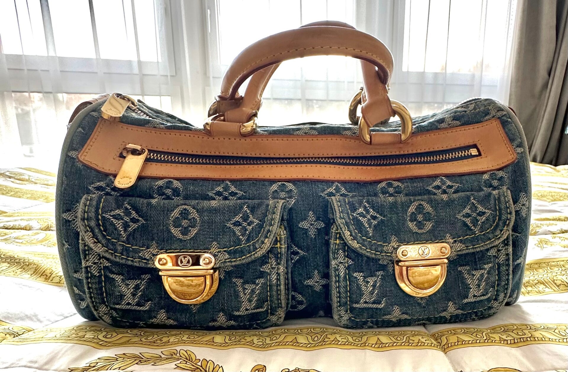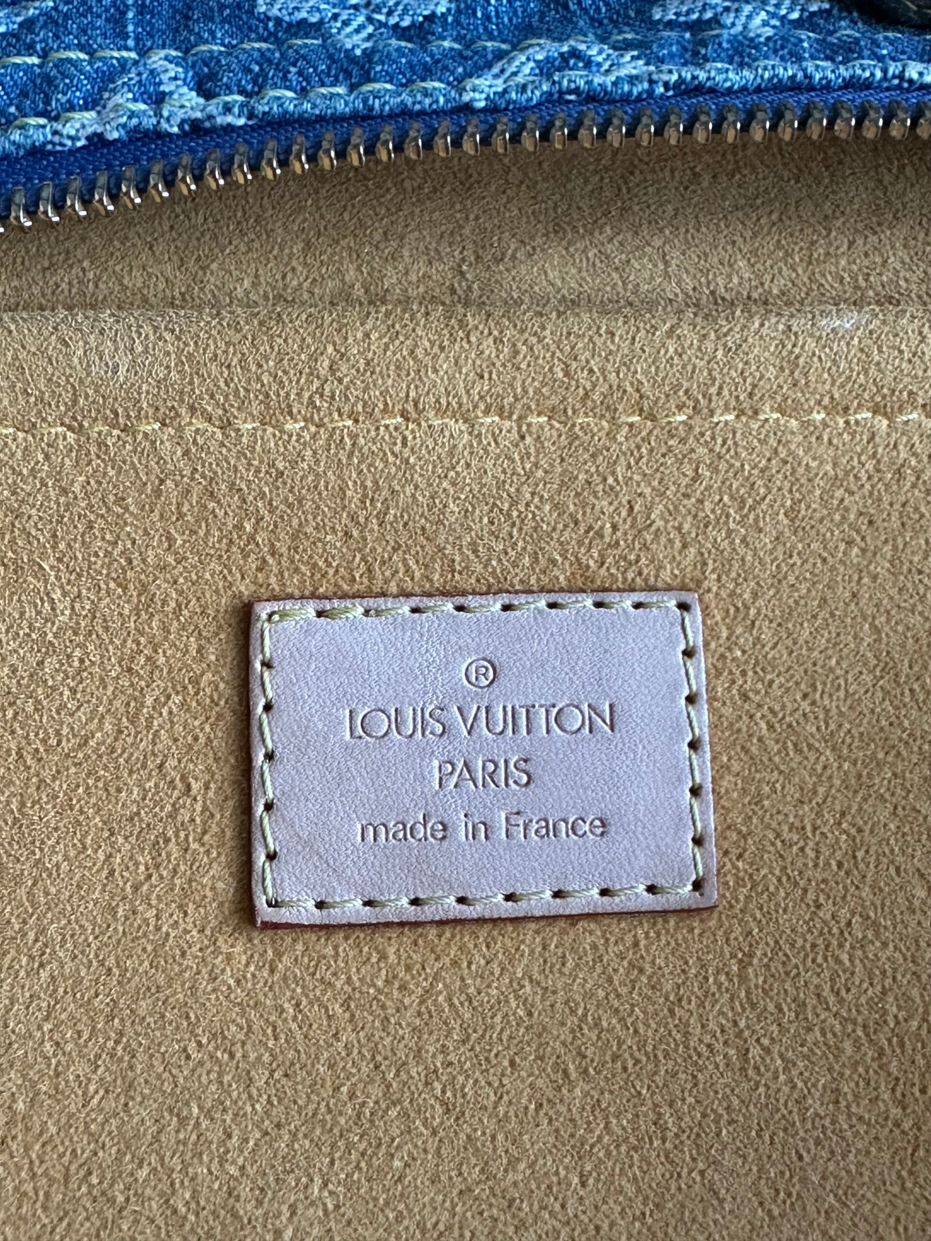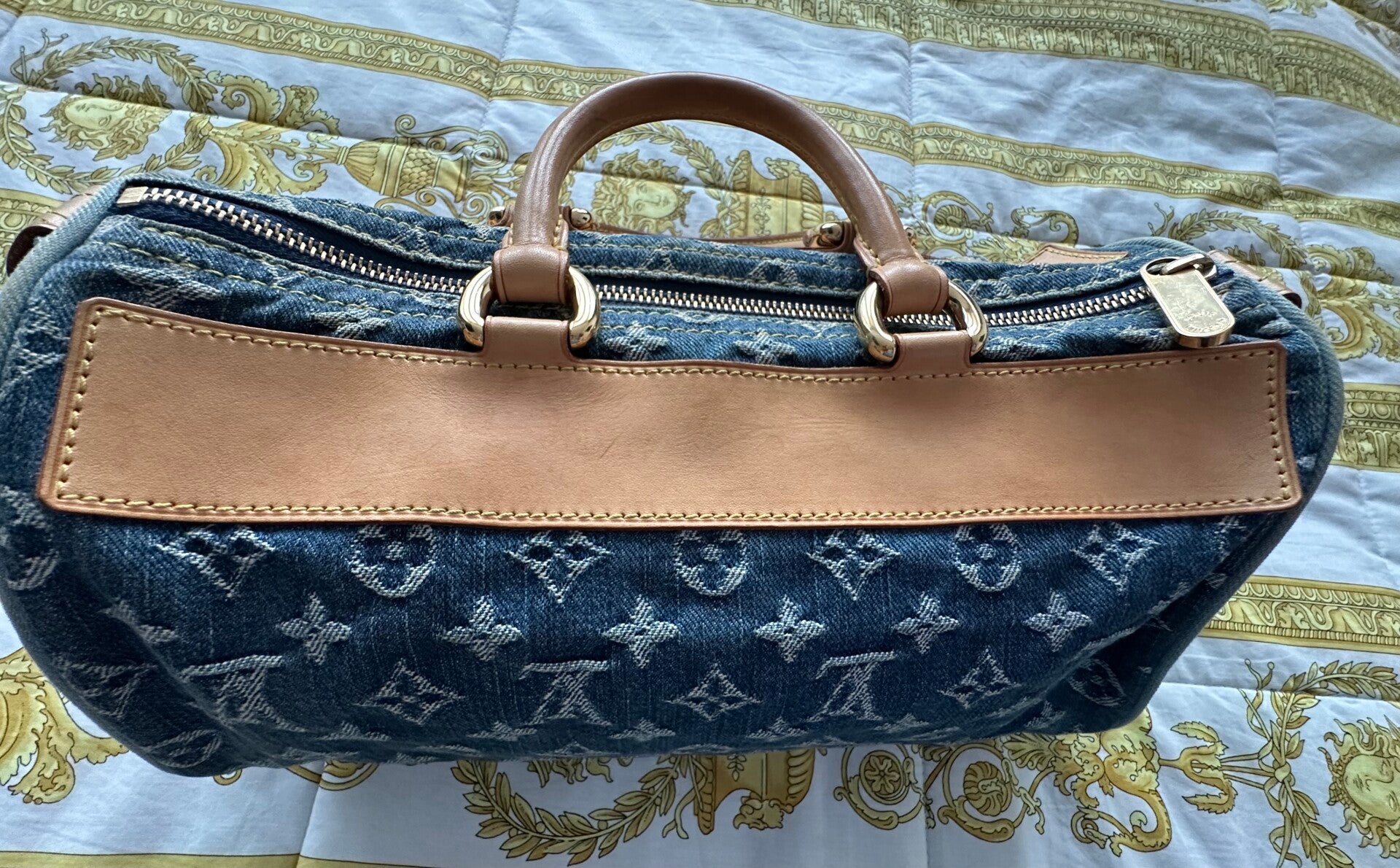 Louis Vuitton Neo Speedy Handtasche aus blauem Denim mit Monogramm-Muster und Vachetta-Lederbesatz.