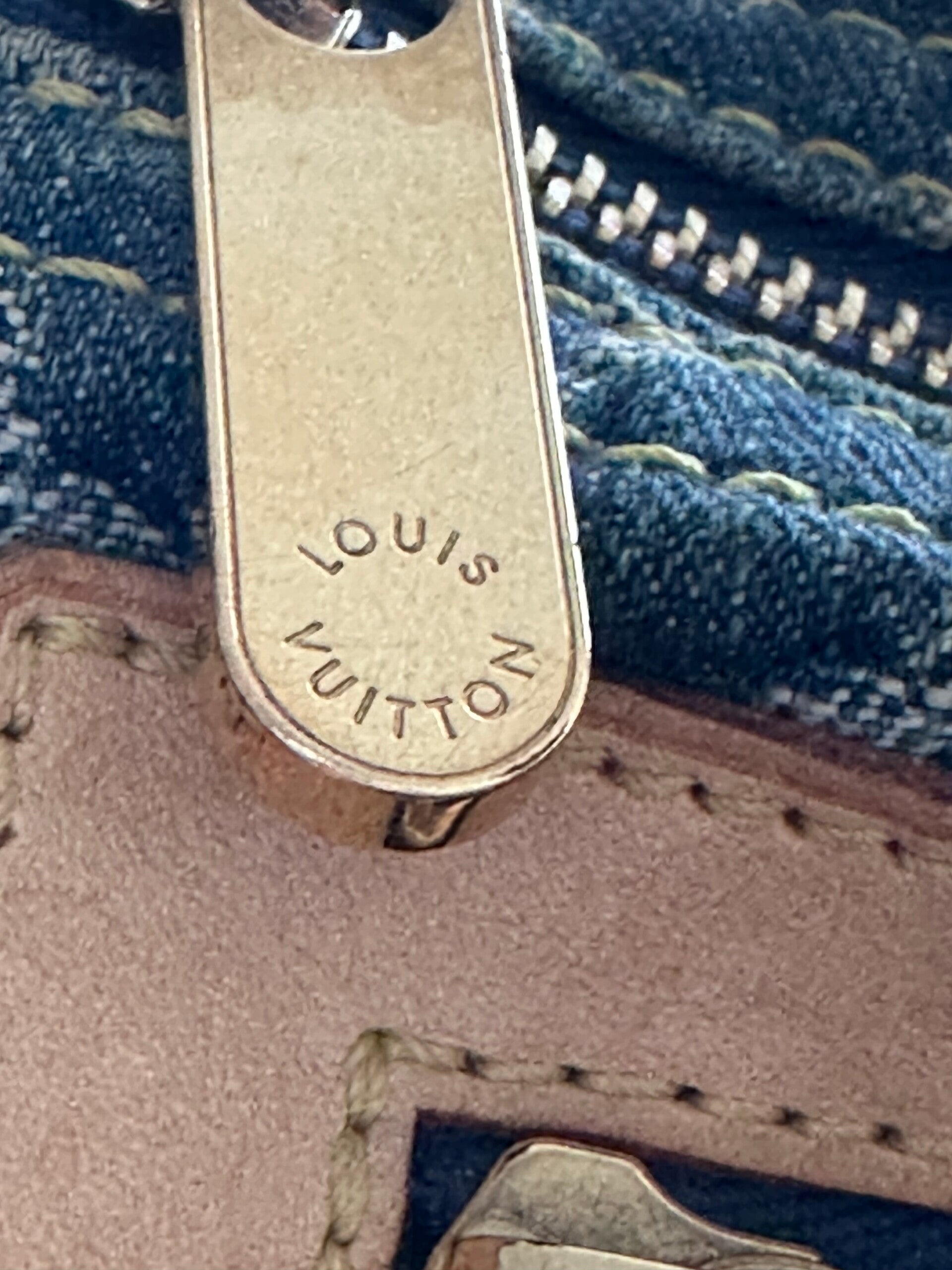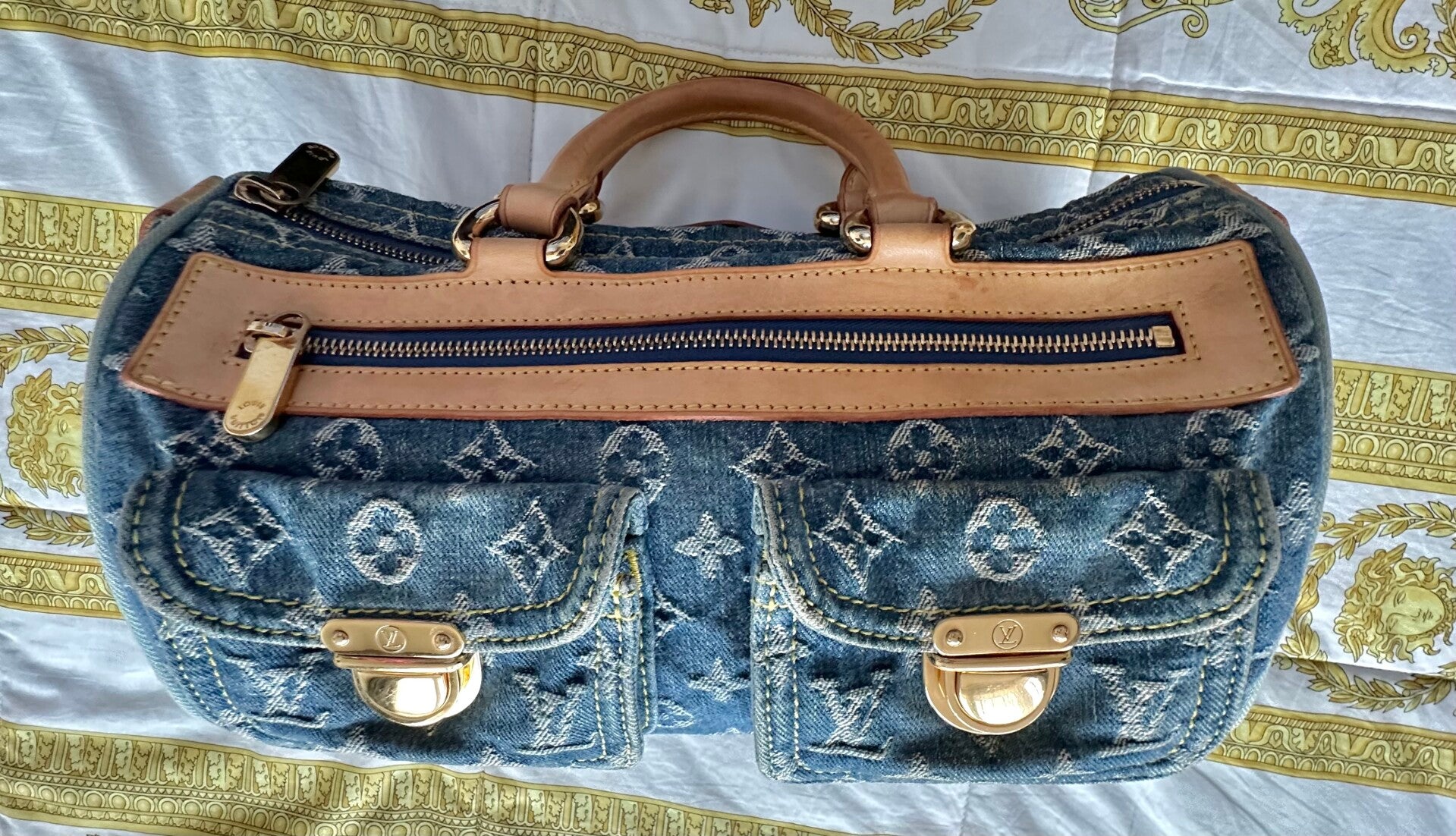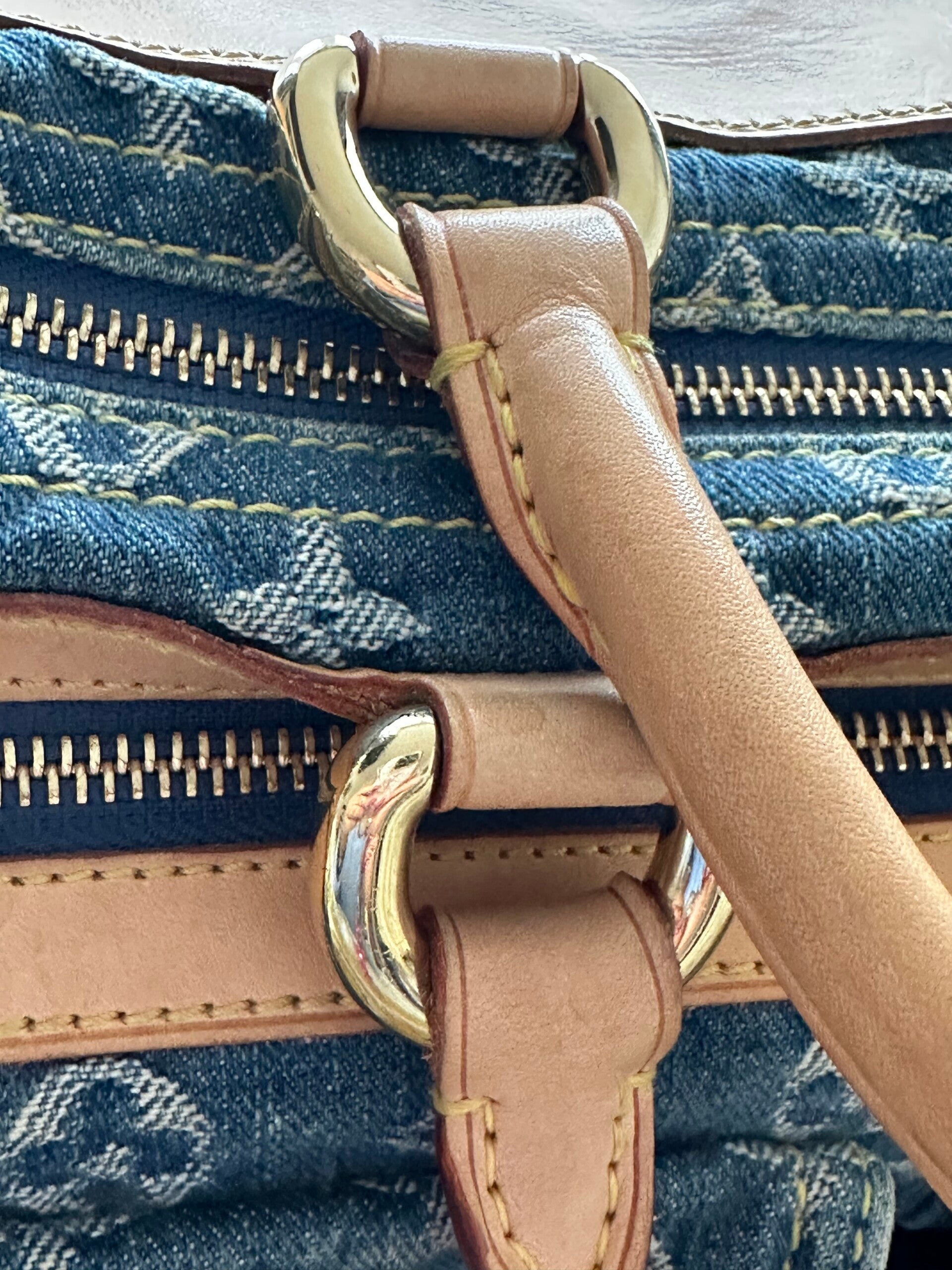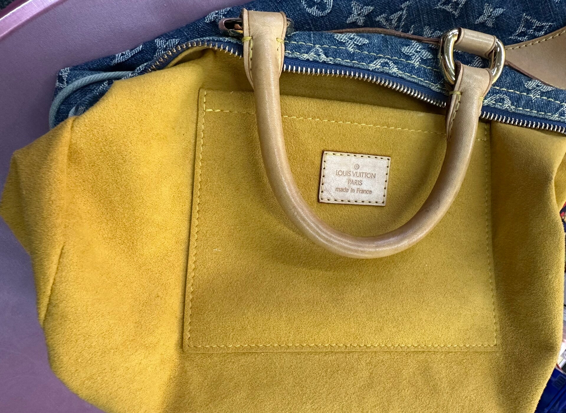 Louis Vuitton Neo Speedy Handtasche aus blauem Denim mit Monogramm-Muster und Vachetta-Lederbesatz.